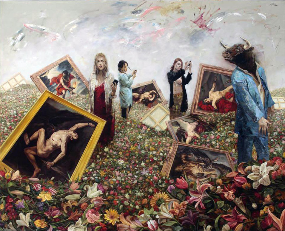Tirar las flores es un modo coloquial de referirse a ensalzar o colmar de elogios, Sergio Garval muestra suelos colmados de flores, a un punto de la exageración y el barroquismo exuberante, por supuesto irreal.