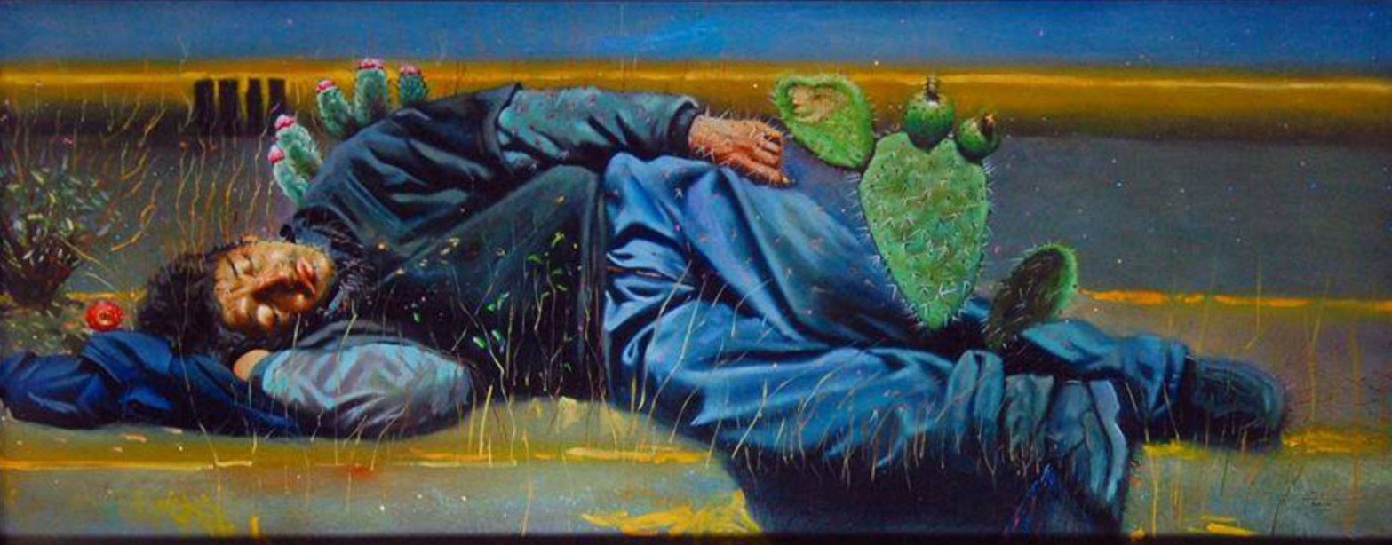 Salvador Santana pone el énfasis cromático en el azul y amarillo, ambos en gamas refulgentes para contrarrestarse sobre los matices complementarios. En actitud vencida por una especie de cansancio frente a la lucha de la sobrevivencia, con las manos llenas de espinas e integrado a la que es la base del emblema nacional, ausente de atributos de herencia prehispánica,con los rasgos faciales de una cultura la cual prevalece más en el discurso que en la realidad cotidiana. El rostro cubierto de sombras, semeja una especie de percance. Despojado de la esfera de identidad dormir es semejante a una agonía consagrada en la pasividad, la del individuo inmerso en una sociedad que le da lo mismo quienes van quedando al margen de la sobrevivencia.