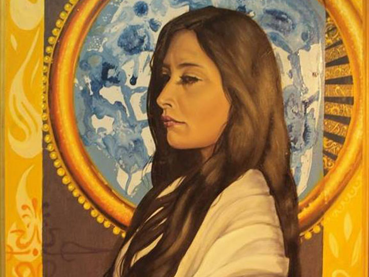 El borde de la aureola amarilla eslabona el pensamiento fijo de la mujer, primero junto a los margenes de su presencia y representación, para designarle un sitio en el macrocosmos, el centro de la aureola es precisamente donde Santiago Gándara realizo un conglomerado de reacciones de color emulando la agitación de las nubes. El cabello ordenado es una segunda vestimenta conferida por la serenidad, el brillo de los pliegues tratados con sencillez le dan un tono de una obra casi intima, un apunte personal sobre el matriarcado.