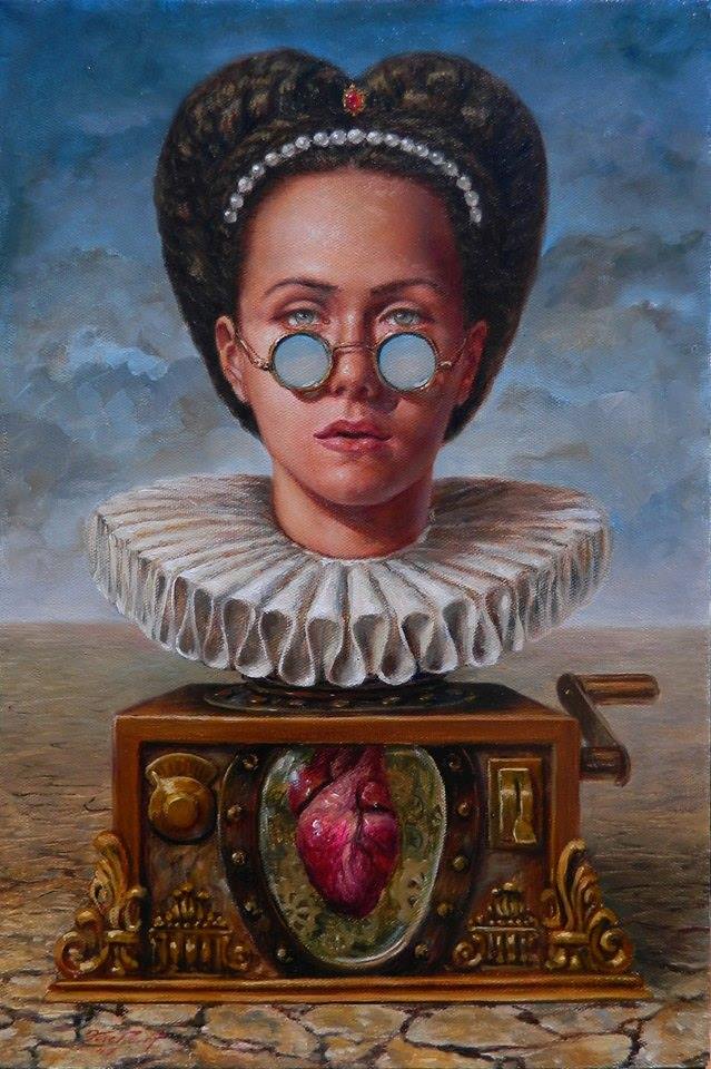 La pintura en si muestra una caja mecánica con el anexo de una cabeza humana, la acción repetible de un acto de comunicación que transmite una forma de sensibilidad, cuando posee un rostro agradable podemos acaso reconocernos en sus creaciones o mensajes contenidos. José Parra confiere a una mujer el mostrar su corazón como prueba de que es una persona que siente, y que en un gesto para atender a quiénes acuden a ella, desciende los cristales de sus lentes.