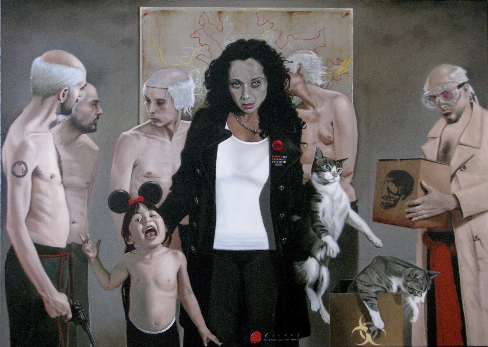 La obra está dividida en dos sectores definidos, del lado de la niña están los resultados inmediatos, ella trae las orejas de Mimi, y junto a ella hay un hombre con un revólver, en actitud impulsiva, él mira a dos personajes que discuten, cazará al gato de modo definitivo, ellos en grupo, con las pelucas en blanco del payaso que busca, son encarnaciones de los factores, en el extremo opuesto, la mujer central sostiene un gato que parece formar parte de un ritual de ensayos. Los sujetos que traen cajas una con el signo de un cráneo en negro, con lentes de protección dispuesto a dejar que muera encerrado, mientras que el felino que sobresale de la del signo de radiactividad parece impaciente.Acaso el preguntarnos si son dobles o momentos reunidos a la par para ofrecer respuestas aleatorias, no lo sabremos.