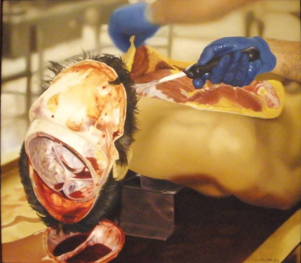 La tapa del cráneo está sobre la mesa igual que un cuenco esta se halla llena de sangre, las manos del forense abren las capas de piel entre la grasa y los músculos, antes de que el conocimiento científico revela el orden de las estructuras que componen al cuerpo, la pura acción implicaría que el acto que es de por si violento, lo fuera aún más. La manera en que trata las vísceras dándole ese toque exquisito de brillos y opacidades en vías de la descomposición, recuerdan a los bodegones barrocos. El sujeto en manos del forense transita rumbo a la breve calidad de objeto de análisis, para luego ser simplemente carne dispuesta a desaparecer.