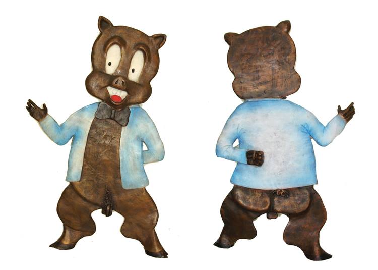 Porky quien era el presentador del show, en su papel de anfitrión lleva una de las manos en señal de saludo, mientras que la otra esconde un puño cerrado. Su piel es oscura y resalta los puntos de los ojos y la sonrisa vaciada en busca de simpatía. Las figuras que de modo más constante procura el escultor, son estas mujeres delgadas y de alturas espigadas, cuando aborda a los personajes de las caricaturas las improntas de la desnudez no advertida en los personajes originales, saldrán a relucir, junto con la cándida mirada que ahora con el comentario de cierta perversidad amistosa va a trascender la ingenuidad prefabricada.