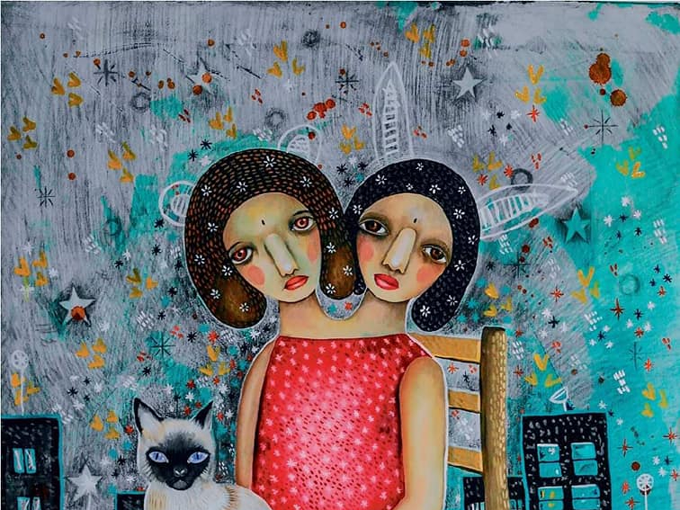 En su obra titulada Siamesas con siamés Maqui Ruíz da cuenta de las sutilezas que definen a sus pinturas. El acercamiento con el lenguaje de la ilustración es en su trama expresiva un modo de desencadenar significados. No existe una historia previa a la que Maqui de luz. Es más bien su deseo y capacidad de crear situaciones, momentos, escenarios y personajes lo que entra en juego.