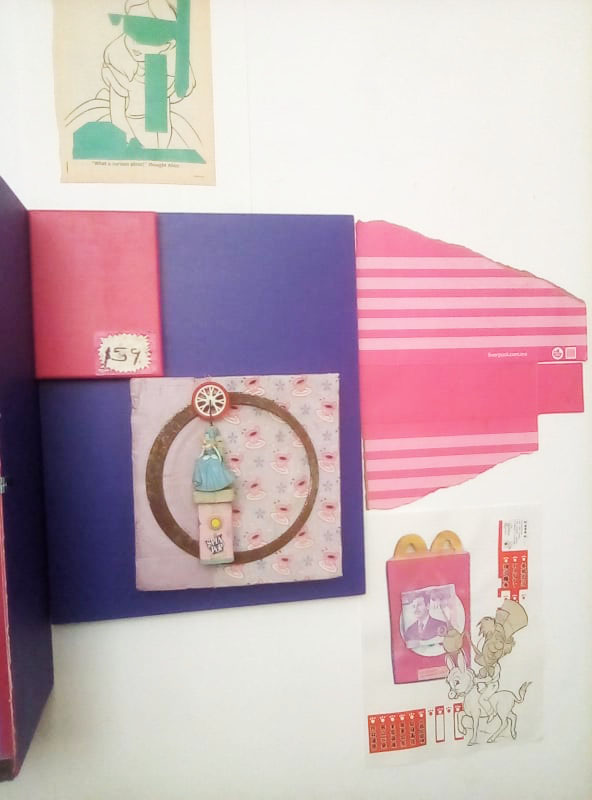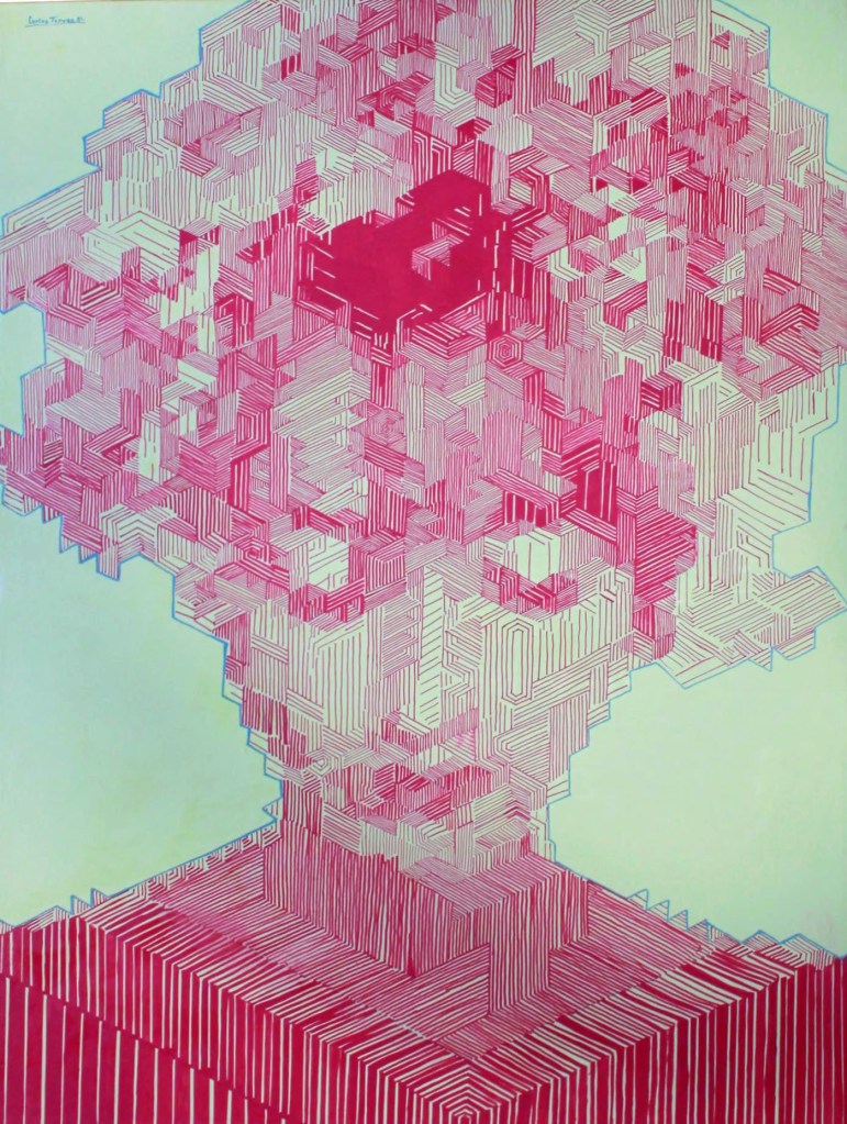 Las Pink flowers de Carlos Torres son imaginarias. La corona de flores está sugerida por un tejido hexagonal de pixeles con esgrafiados graduales. En contraposición a esta obra encontramos las iluminaciones de Dan Montellano que haciendo uso de una lectura mental de dos polos de la apariencia nos remite a la fragilidad de la carne. Dan es un artifice de juegos que puntualizan un estado de cosas que ocurren simultaneamente y que disociamos para no adquirir consciencia sobre las consecuencias reflexivas de lo real.