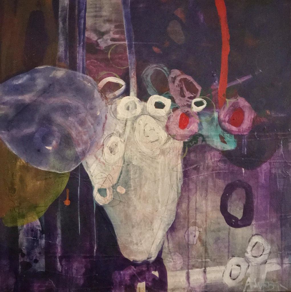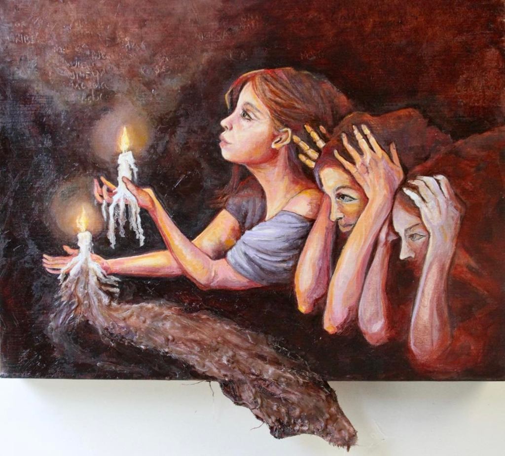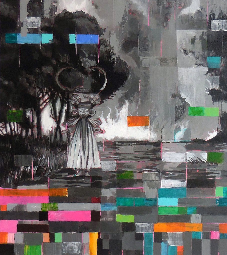 Si buscamos el fuego entre los grises del cuadro de Sofía Echeverri el color de la ceniza nos recibe como sensación absoluta. La máscara ancestral de una diosa de la cual extraviaran el nombre específico a través del tiempo nos recibe. La artista habla de un misterio ancestral que liga a la mujer agua a los procesos creadores de la naturaleza y fin de ciclo asociado con lo vivo.