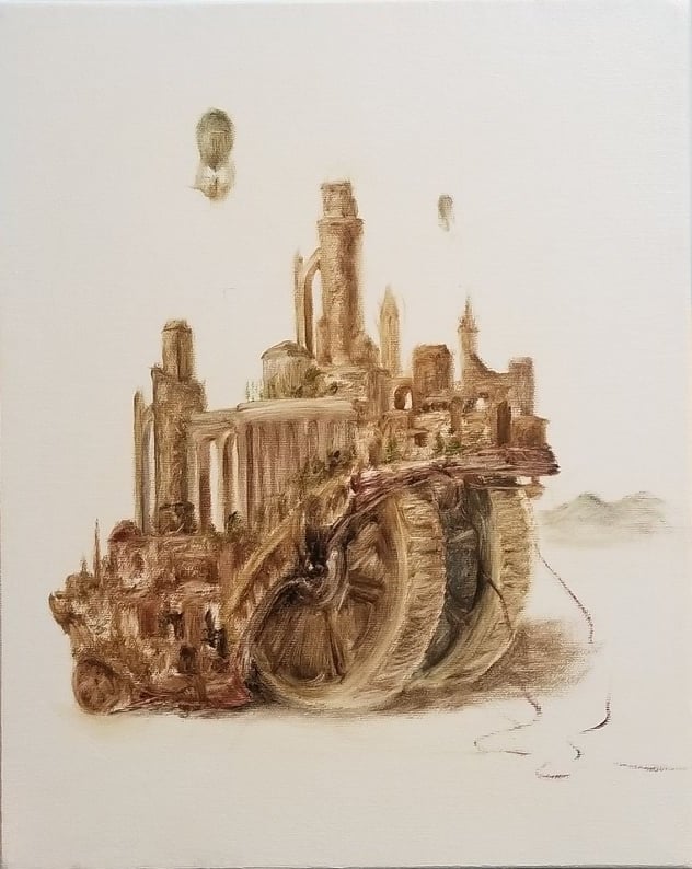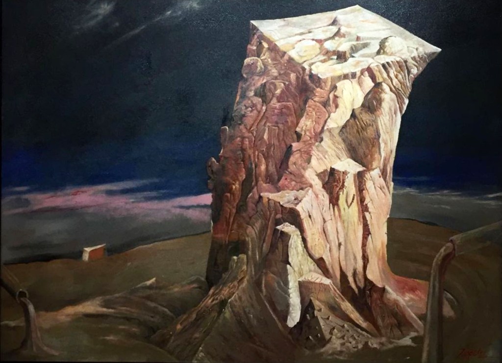 El castillo rodante de José Parra surge de una fantasía que pretendiendo lo sublime discurre sobre los logros personales que son el mausoleo constante de una vida que va de paso. Sobre grandes y pesadas ruedas. El monolito pétreo de un paisaje fallido que delineo Gilberto Ortega alias el Infeliz ilustra la zona limítrofe entre la supuesta obra de lo natural y la idea de permanencia que carece de esperanza. Sin embargo el humor y la ironía prevalecen acaso en el tratamiento plástico que el Infeliz realiza.