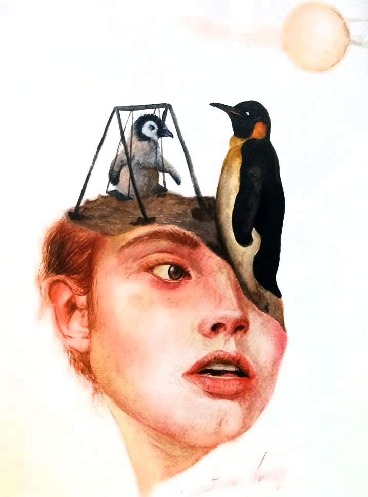 Las aves disociadas de un entorno natural somos nosotros según propone la artista. En una de sus obras Un pingüino separado de la postal imaginaria encuentra sobre una cabeza derretida los vestigios de un columpio. Un cráneo dentro de una jaula confirma la separación anatómica de la personalidad extraviada. Julia Avalos deletrea las situaciones idealizadas donde las distintas condiciones de lo humano descubren la reluciente fragilidad inherente a lo vivo, sin embargo Julia Avalos la muestra en su belleza simple e inmediata.