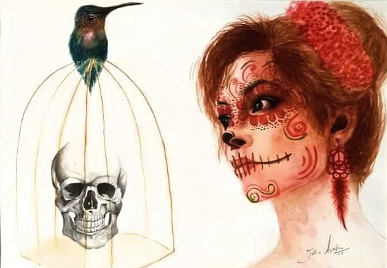 Con acuarela y dibujo la artista vuelve casi transparente los cráneos de aves. Las máscaras provenientes de la época de la peste negra o inspirada en el estilo, parecieran préstamos para adoptarse dentro de los imaginarios personalizados. Incluso más allá de un fin puramente practico, Julia Avalos amplia así el repertorio de aspectos lúdicos para entender los espacios mentales de libertad.