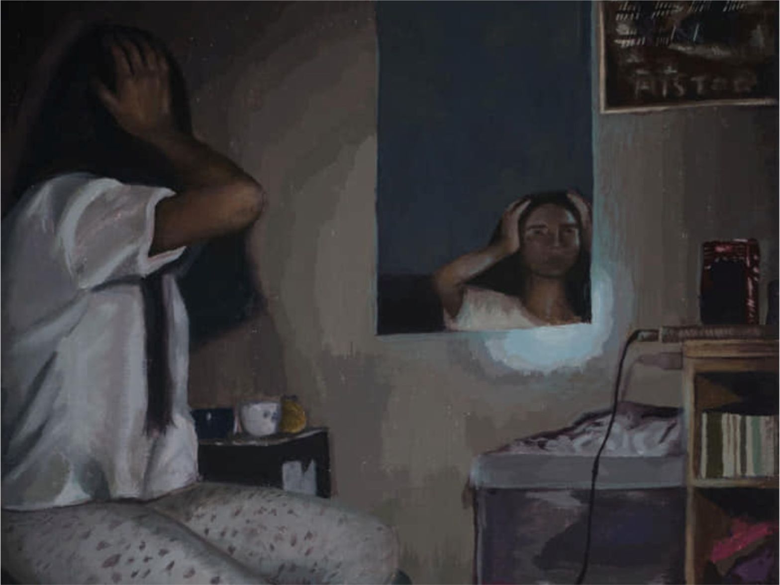 Dennis Valencia pinta a una mujer que vuelve la vista hacía quién la pudiera estar vigilando mientras el televisor en la cama yace encendido, ella sobre el suelo y con los pies debajo de la cama olvida su incomodidad para reducirse al entretenimiento inducido. Dennis Valencia indirectamente analiza aspectos de una individualidad que va diluyéndose en medio de simulacros.