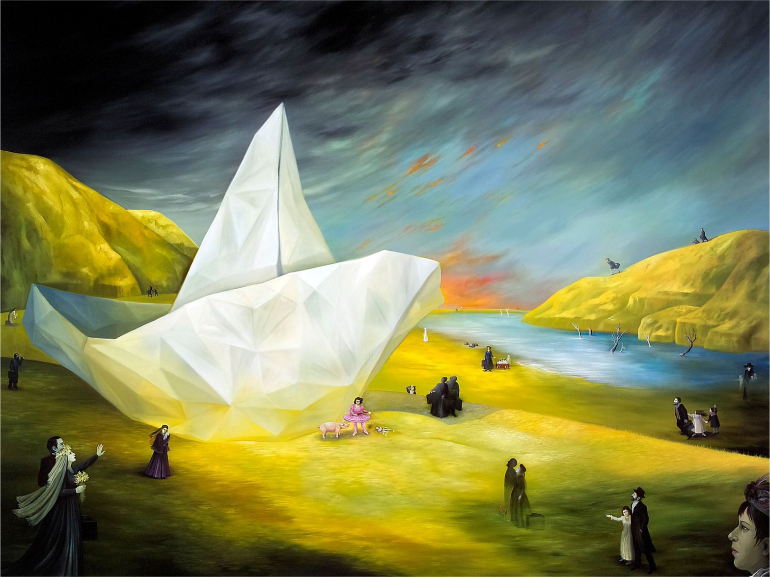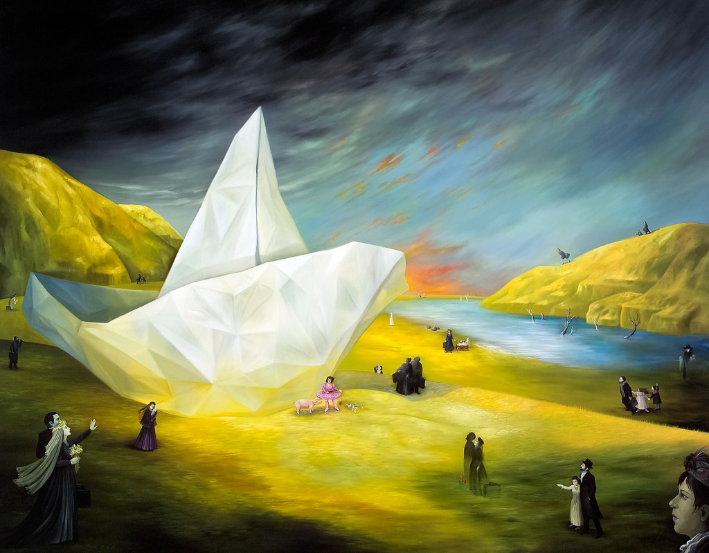 Los barcos en las obras de Lucia Maya están hechos con hojas en blanco, esas mismas que son un espacio en común para escritores y dibujantes, Lucia Maya entreteje las fábulas o la poesía que no ha sido aprisionada en las formas literarias, acaso porque su deseo es continuar imaginando los enlaces y variaciones en medio de sus paisajes. El árbol con las raíces expuestas o la lava del volcán que con lentitud camina, representan motivos para ir trazando espacios para el deleite de simbologías en movimiento, su espíritu encuentra los hilos perfectos para reunir a los personajes en medio de encrucijadas donde fantasear salva una parte de la existencia.