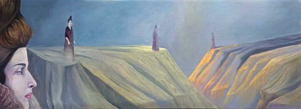En su obra llamada la Luz habita más alto… una mujer desnuda de piel blanca flota contrapuesta a una dama vestida de luto que avanza hacia nosotros. La ilusión de lo que es invisible y que culturalmente le concedemos el protagonismo simbólico nos vuelve frágiles, por otra parte en el elegante paisaje de montañas que Lucia Maya dedica al eco, a través de estas búsquedas en medio de la nada nos muestran la justa dimensión del ser humano. Las nubes que viajan sobre los barcos de papel son las esperanzas de fertilidad, que por insistencia de los ciclos temporales nos renueven. La pintura de Lucia Maya con mujeres de grandes faldas paseando sobre el pasto de praderas cuyos accidentados relieves cuentan las eras pasadas, proponiendo son los escenarios para inspirar la duda que deviene en creación de paraísos personalizados.