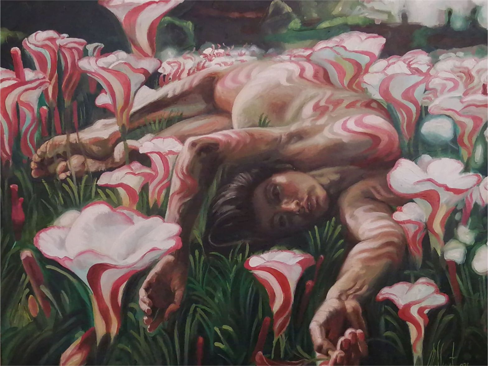 Una figura yacente en escorzo es rodeada por formas de bastones caramelizados, los cuales están en pleno derretimiento. Si la mujer va del fondo hacia el frente o viceversa los bastones que semejan hongos sobre el pasto irían de arriba hacia abajo, Homero Regla propone un discurso espacial que entrecruce los polos de referencia y los gradué bajo escalas que incluyen lo accidental. En la tradición de la pintura el escorzo que es la vista forzada de un ángulo ha sido un territorio de reflexión plástica, producidas con variadas soluciones técnicas.
