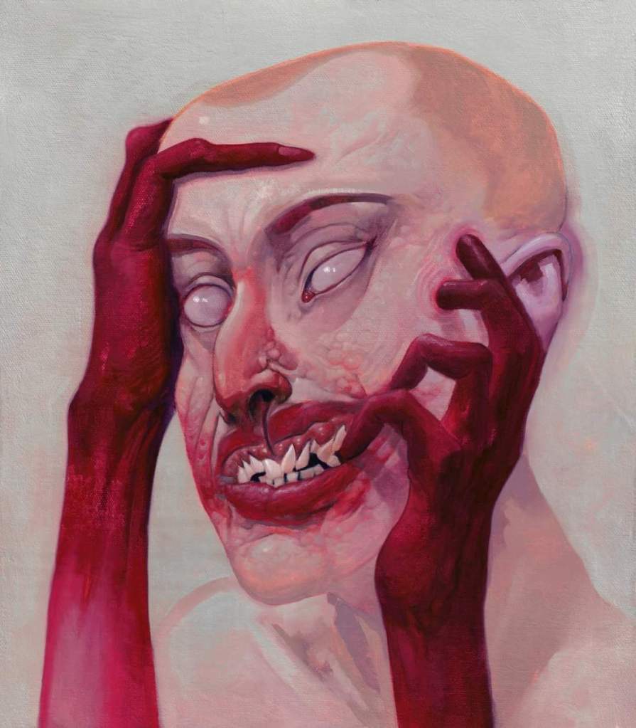 Si el dolor y el placer van a entretejerse, el caso de uno de los potenciadores hacía la autodestrucción radica en la ansiedad. Ese deseo por lo inasible o la certeza de que algo que va a escaparse de un absoluto control, inciden por medio de malinterpretar cuanto nos rodea. La mente de Dos Diablos ilustra con unas manos sanguinolentas la aprensión frustrante que modela a ciertas almas, estas que subliman las etapas de las torturas aunque solo existan dentro de planes imaginarios. Los dientes que representa el artista en la obra de la ansiedad óptima; son armas para sonreír desde ese otro extremo de la violencia que puede ser compartida. Hay en la palidez un signo de que la sangre que le tiñe los dedos, es su propia sangre que generosa escurre hasta hacerlos una especie de guantes. La retina vaciada y con la reluciente ambigüedad del éxtasis interiorizado, nos provoca una inmersión involuntaria frente al vértigo de razones que nos son del todo inaccesibles.
