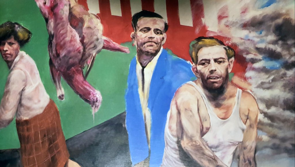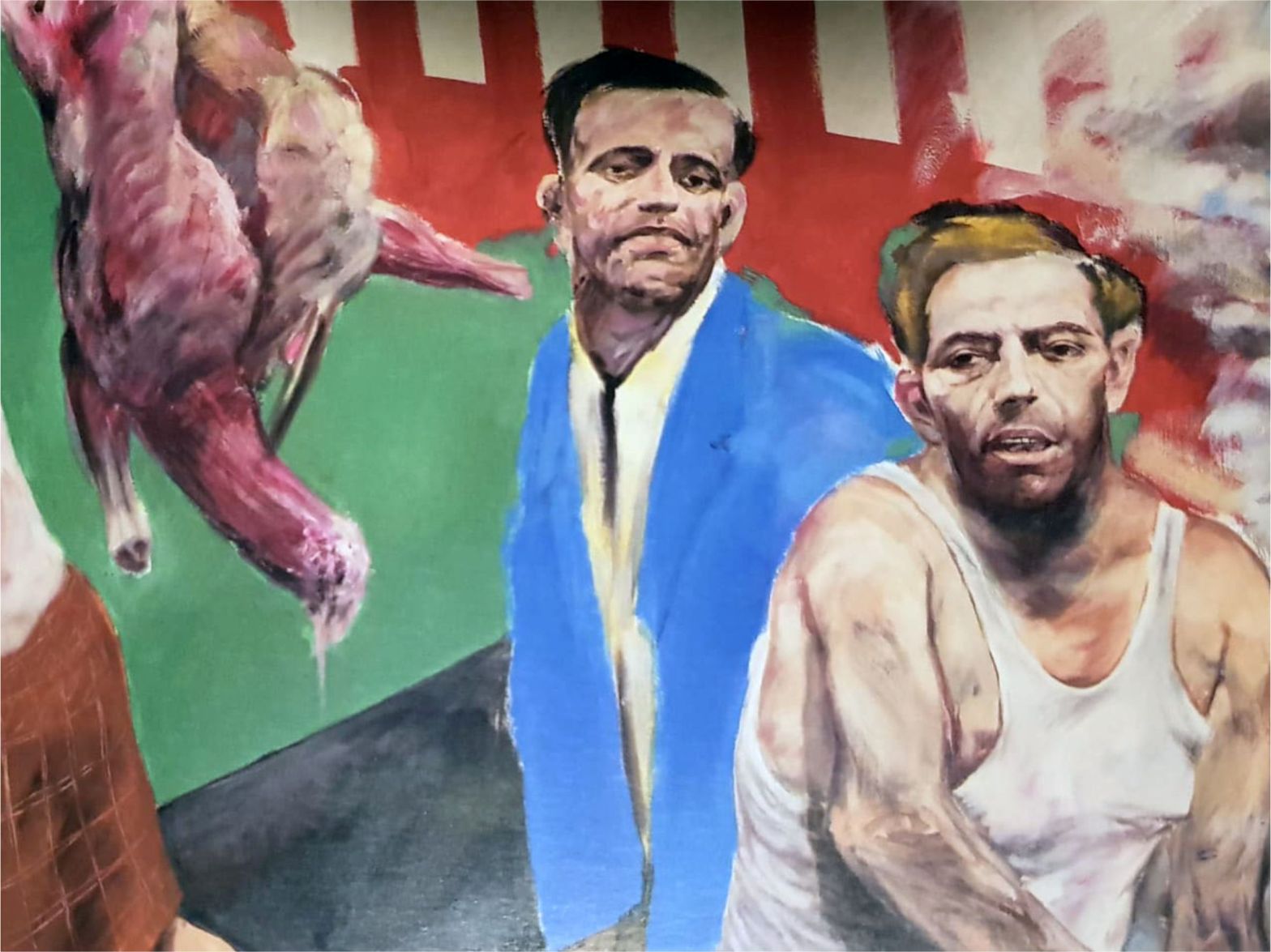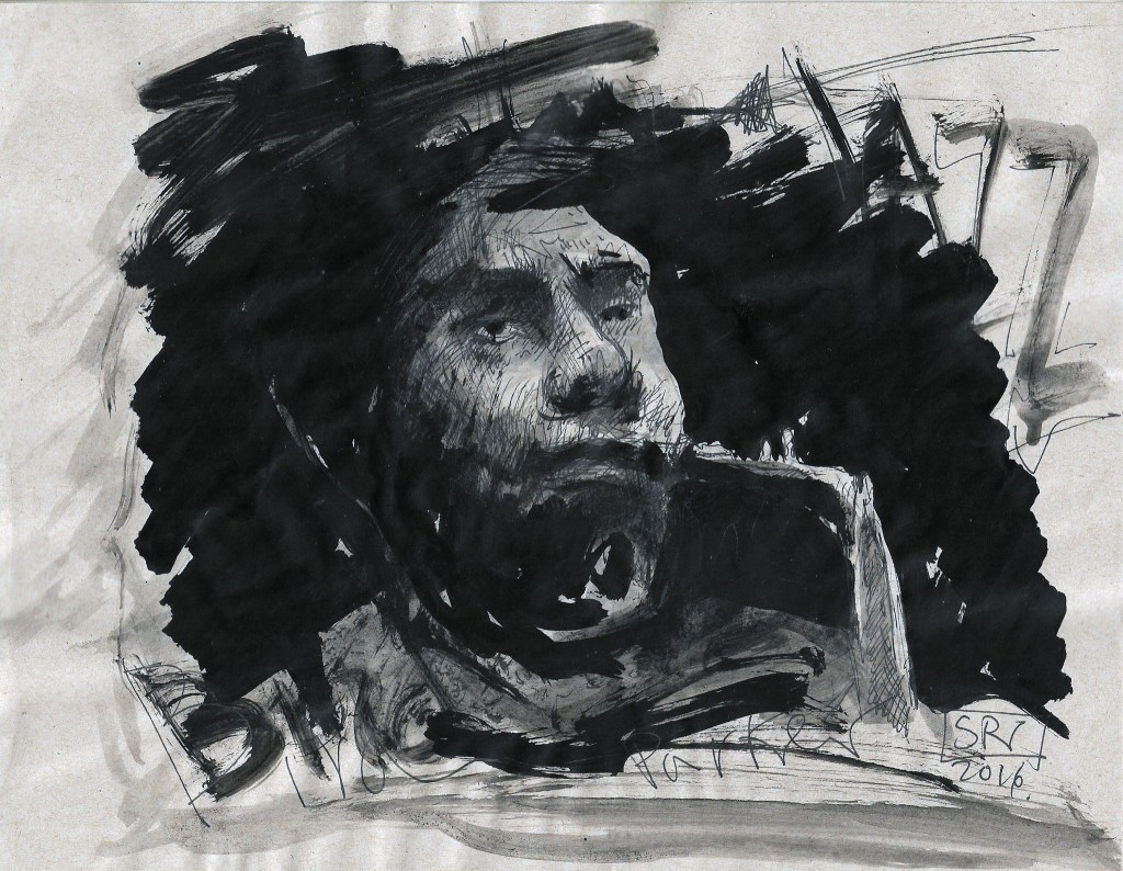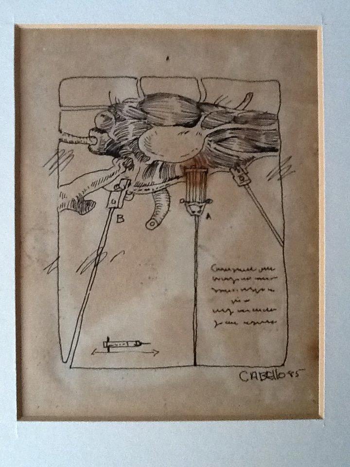 En la obra seminal de Francis Bacon que el artista título como Pintura, el yo central de la historia del arte está cercado por una secuencia de arropamientos que más que definirlo para anular su probable existencia. El personaje bajo la sombra de un paraguas, con el rostro iluminado a la mitad, trae una gabardina que remite a su momento y situación de actividades ocultas. La res abierta en canal y el cerco de tubos que separan; son recursos que Bacon convertirá en jaulas y en el caso de las carnes seccionándolas hasta lo irreconocible. La influencia de Francis Bacon dentro de los dibujos y pinturas de Javier Campos Cabello, a través de los que pone a estos amasijos de carne en suspensión tal vez en calidad de costales de vísceras, los cuales han dejado de servir. La carne y la sangre cediendo ante su desaparición gradual, fue analizada por Martha Pacheco en un inicio con un sesgo erótico sobre la fealdad, y esta circunstancia la bifurco rumbo a la desintegración mental que somete al sujeto. El peso inminente de saber que moriremos enmarca a la obra del artista en una serie de angustias y soluciones que si someten el arrebato consiguen describir algo que no únicamente concierne al discurso del arte si no a la condición humana. Salvador Rodríguez pensando en los “nadies” explora formas de morir en vida.