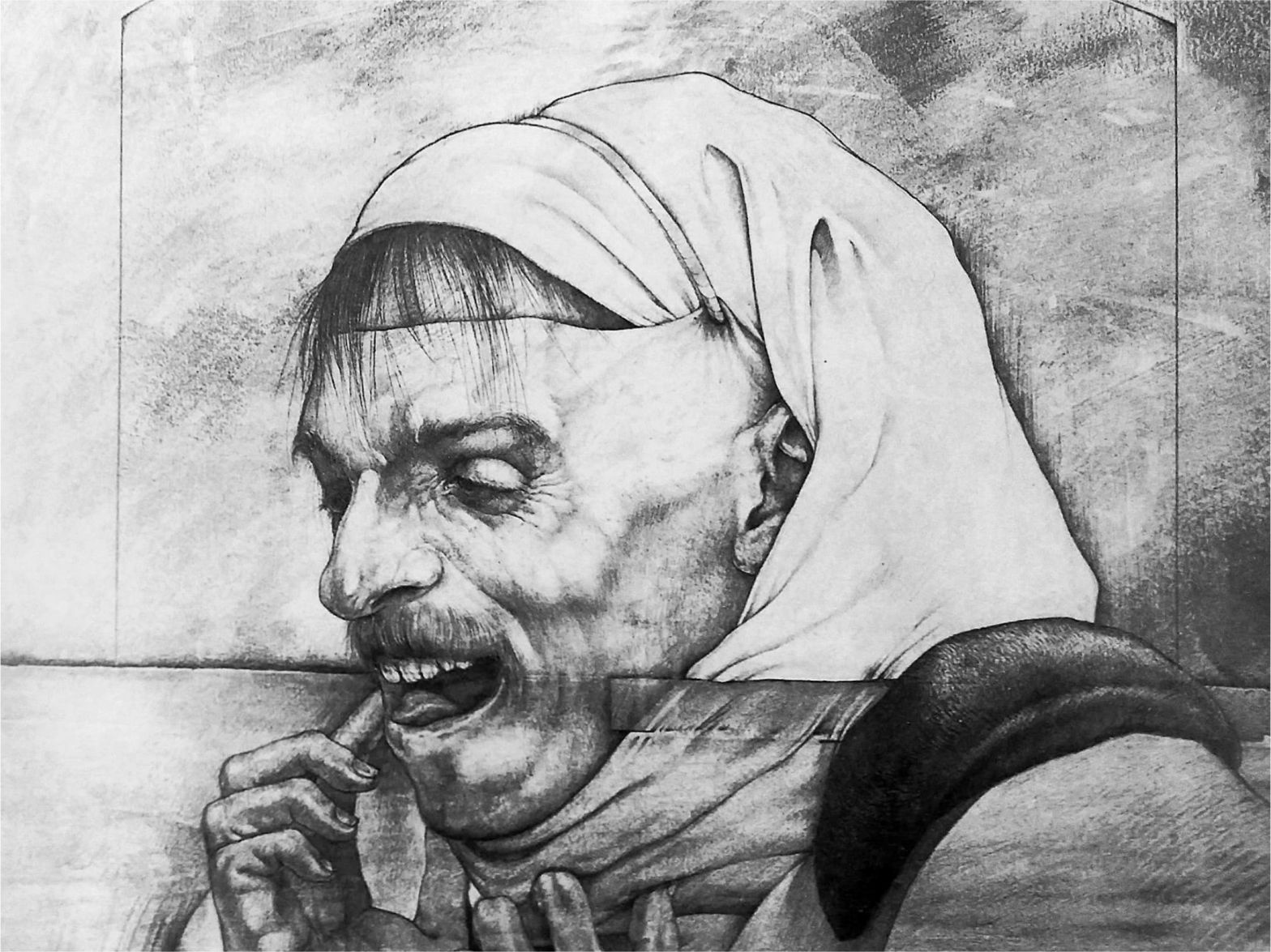Entre el cúbito y el radio el área que enmarca una forma conocida como la almendra que en las nociones de la sección aurea corresponde a un orden armónico. De la carne degradada por la lepra José Fors extrae el carácter de su personificación de una consciencia consumida por varios tipos de enfermedades. Ataviado como personaje de la época bíblica, es la manera de representar a la culpa convertida en moda tradicional. El dibujo de José Fors incide en la pelea interna que realza la construcción anatómica que en su rigor esconde la identidad del sujeto, lo hace para universalizar los malestares que amenazan desbordarlo. El artista coloca el dedo central delatando la máscara a modo de una tela más que envuelve a los huesos y a las musculaturas, las cuales palpitan bajo una podredumbre moral que justifica el arrepentimiento. La penitencia sublimada forja a los santos. Las rayas sueltas que son ensayos del pulso del artista, por medio de los que nos narran los accidentes filtrados por el criterio del dibujante para naturalizar hábilmente los drapeados de las vestimentas, o la carne que cede ante las inspecciones inquisitivas del espectador.