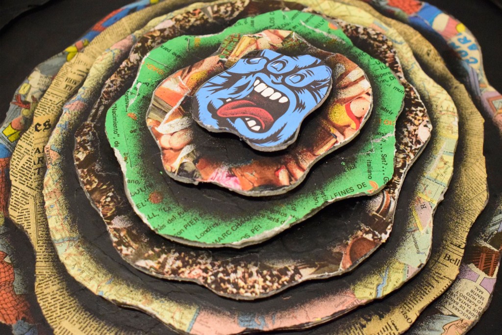 El arte de mutar un vórtice en un sistema piramidal involucra el pensar en lo opuesto, es uno de varias conjugaciones en que Iskar sitúa la antítesis de la idea formal que presenta en su obra. El tratamiento del collage a modo de material para cubrir zonas de color o áreas de niveles diferenciados, define la manera en que la línea sombra desvanecida separa y asocia secuencias de color con una textura visual determinada. El centro de las sensaciones que transmite el vórtice resultara ondulante, en este los bordes establecidos por Iskar surgen por desgarramiento del papel y el aerosol los complementa.