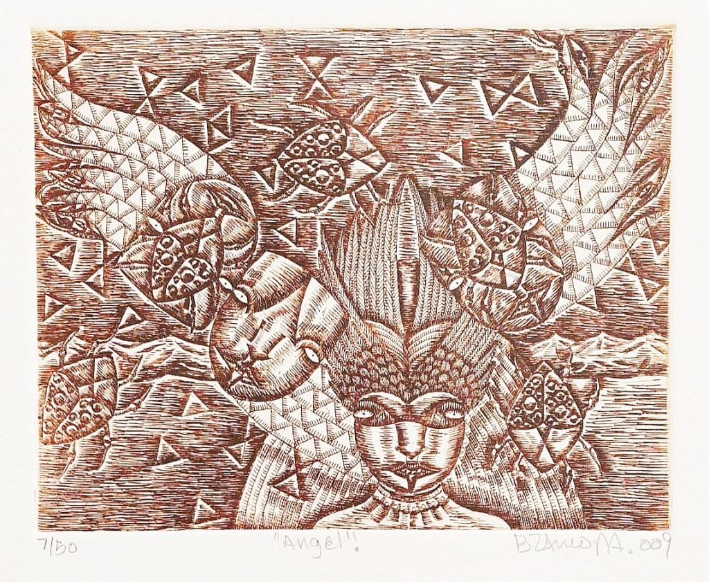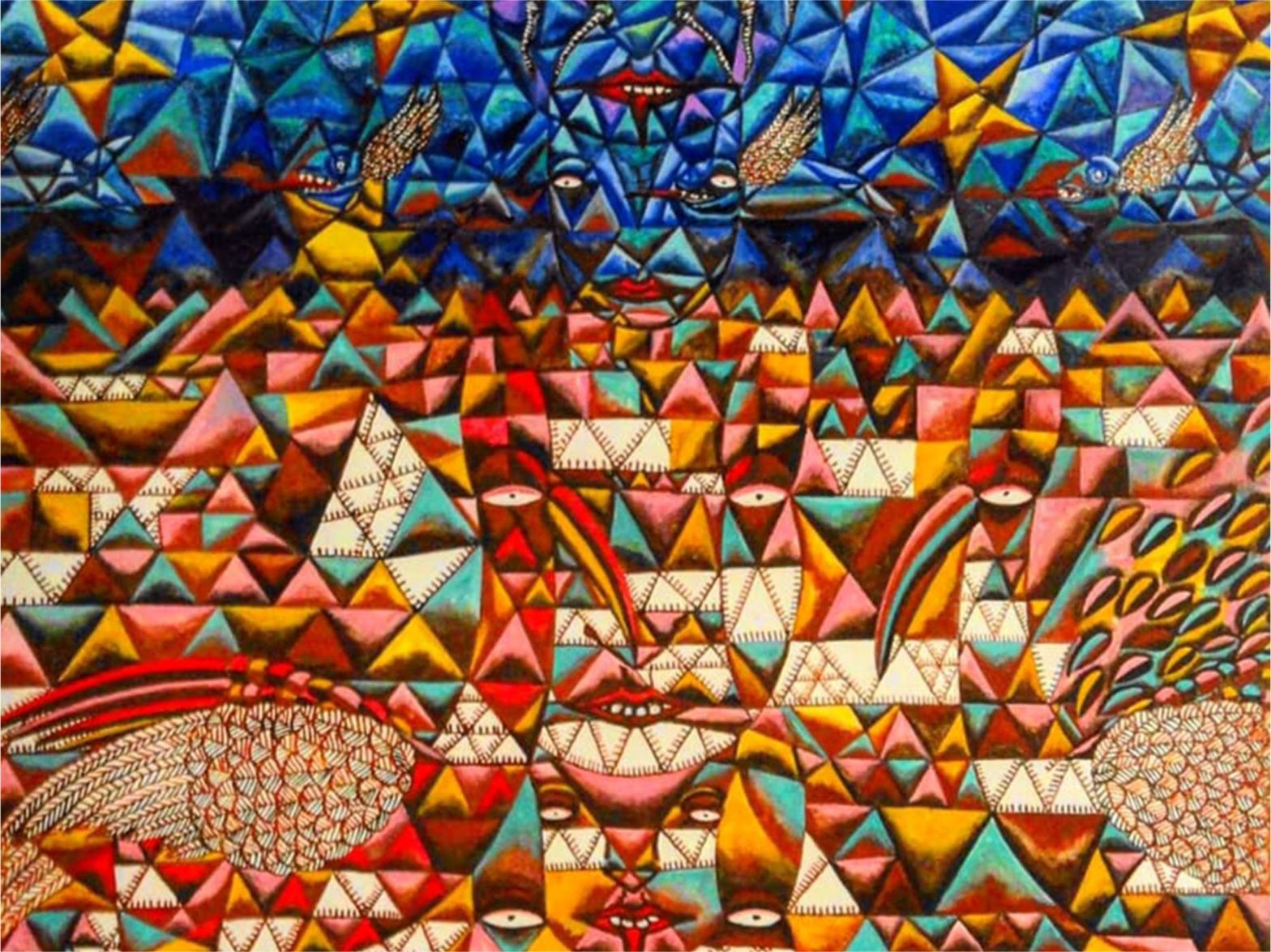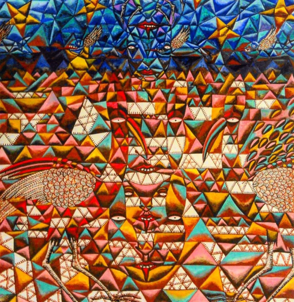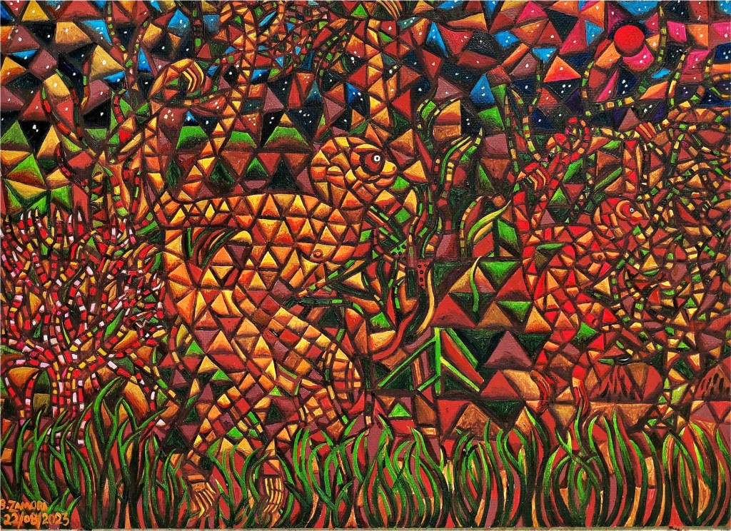 La geometría primigenia de las culturas milenarias, las formas orgánicas ordenadas según el sistema de patrones áureos aparecen sugeridas constantemente al apreciar la obra de Benito Zamora. Su ingenio organizativo de simetrías que fructifican en símbolos, el trabajo del artista abre el portal de un imaginario que de manera guiada construye el desarrollo de contornos que al igual que las escamas van a incrustarse entre sí. La ornamentación es un arte supremo y como menciona Pedro Friedeberg era una vía para entender lo sagrado, desde las constelaciones simétricas de teselados a el rediseño de esquemas que tienen a ordenamientos superiores. El oficio del artista en sus rudimentos es semejante a los afanes del artesano o de un técnico científico, los descubrimientos convertidos en herramientas de trabajo, dependen de su efectividad. Benito Zamora combina todas estas facetas para elaborar el complejo entramado de sus piezas, en medio de los parámetros que él mismo establece conseguimos detectar el disfrute liberador de los entornos que diseña creativamente. Un rasgo constante de las figuras de Benito Zamora es definido por la inmovilidad contemplativa, sus personajes a modo de arboles extienden sus signos por medio de objetos o situaciones circundantes.