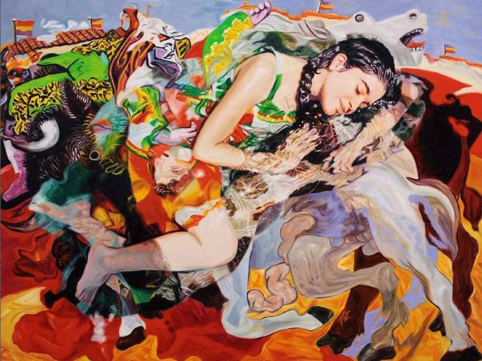 El pintor Pablo Picasso durante la realización de su serie de Minotauromaquia hizo varias referencias a las batallas del ruedo taurino, la alegoría del héroe que intenta vencer al toro, en el imaginario de la isla del rey Minos lo hacía con el Minotauro. La emotividad de la leyenda subyace en el inconsciente, la pulsión de aquellos que advierten la cercanía de la mortandad sabe que la fiesta corresponde a una alegoría de los límites de la presencia vital. Carlos Vargas Pons envuelve a la mujer con una bandera simbolizando una suerte de representación sobre la caída, o de acto de consciencia el cual únicamente es posible a través del ser experimentado de modo directo.
