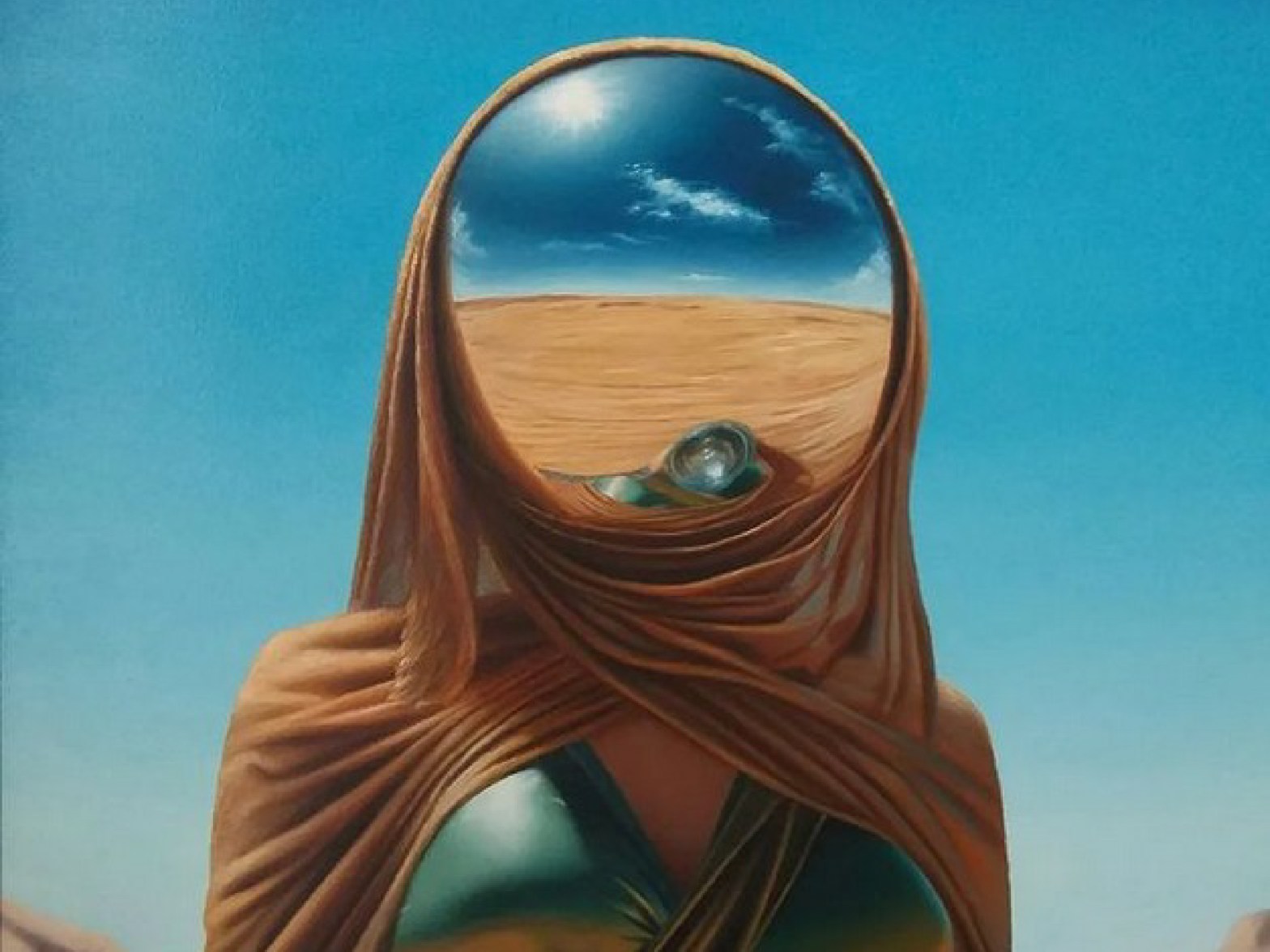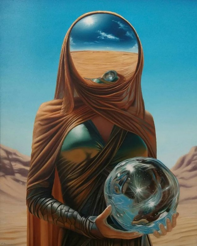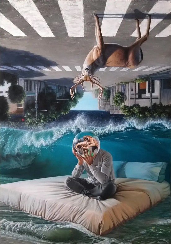 Las esferas reproducen el ojo a manera de captador de la luminosidad, en este congrega su lenguaje Cesar Plascencia por medio de una analogía aumentada en su formato para resaltar valores efectistas durante la representación de paisajes o entornos. Al avanzar sobre un realismo que media entre lo fotográfico y que da credibilidad a las conjugaciones fantásticas o surrealistas, César Plascencia consigue entrar en las sensaciones e ideas que deambulan y quedan fuera de la atención inmediata, el artista al elaborar consistentemente los detalles ahonda al respecto de un estado sobre el borde de la actividad pensante. Lo social es analizado por César Plascencia desde la corona de petroleo que escurre estructuras, a las monedas no tangibles del bitcoin, el deseo por ilustrar obedece a una actitud contemporánea por tener un testimonio sobre los hechos significativos. La I.A. es un producto directo de dicho anhelo del llamado homo videns, César Plascencia confiere un interés esencial a verificar los fragmentos de realidad que entreteje en sus composiciones, la calidad de los efectos materiales de las apariencias, no es esquemática, el artista pretende darle una categoría de certeza casi tangible.