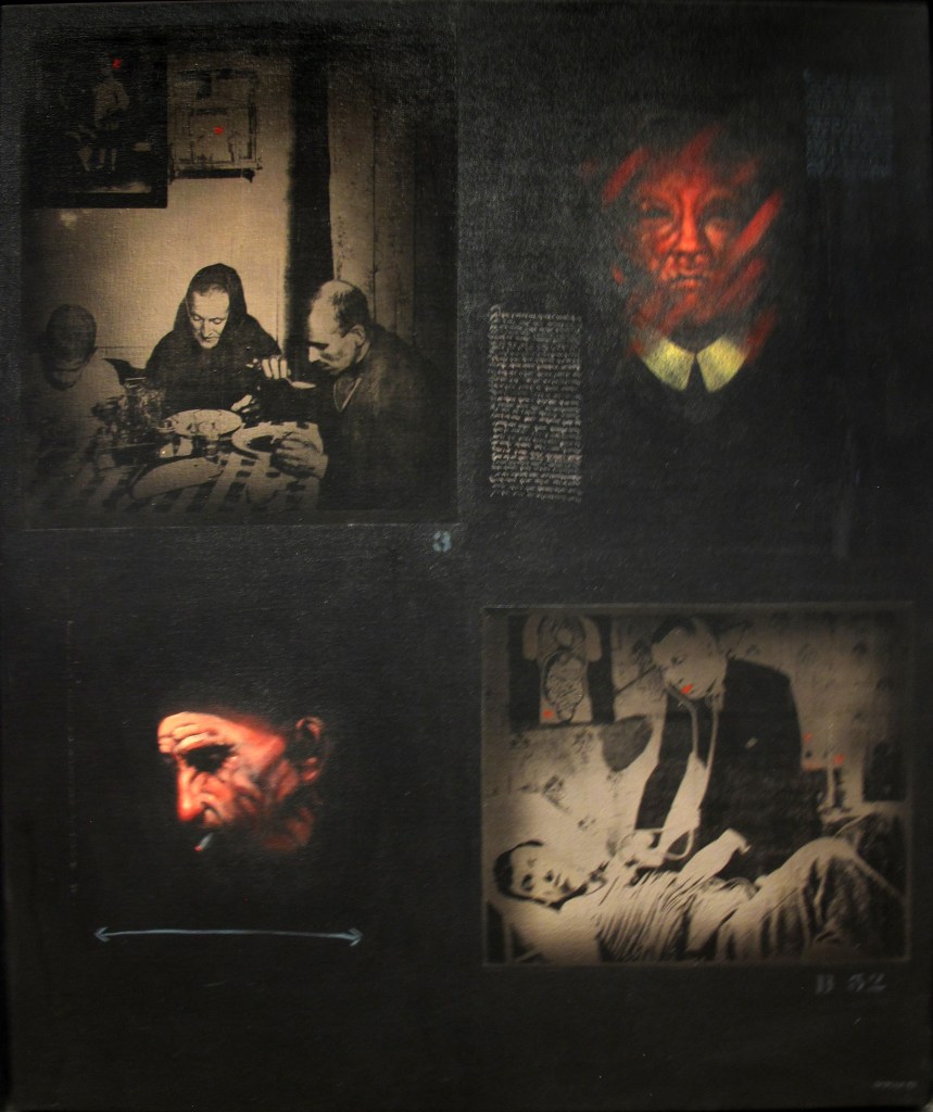 Los solitarios en su ecosistema de muebles y vestimentas para reconocerse, colocados en un plano intermedio de una temporalidad dependiente de la incidencia de la luz que curte sus cuerpos. Las pieles verdes emanan de un moho estancado que, alejándose de la sequedad, están privilegiando hacer surgir de su decadencia en un renacer de las cosechas porvenir. El modo de representar al Dios Osiris que reinaba en el inframundo para los egipcios, era con el traslucido efecto de una epidermis que lo caracterizaba. Javier Campos Cabello da vislumbres de los enigmas que confluyen dentro de las grandes ciudades, estos acontecimientos quedan soterrados, los rituales privados rondan del vaso de vino a la música de los clubes nocturnos en que van a refugiarse. El artista extiende una ficción cuya continuidad une varias escenificaciones, el relato enmaraña a seres que asechan de reojo acorazados por gafas oscurecidas por la indiferencia mutua, felizmente correspondida, por ello tratan de sonreír y conversan, aunque a momentos nadie siga la trama de sus delirios.