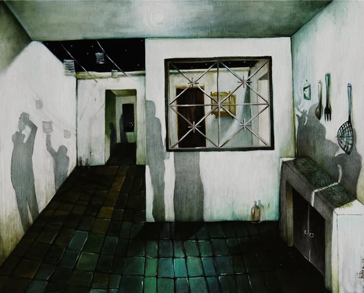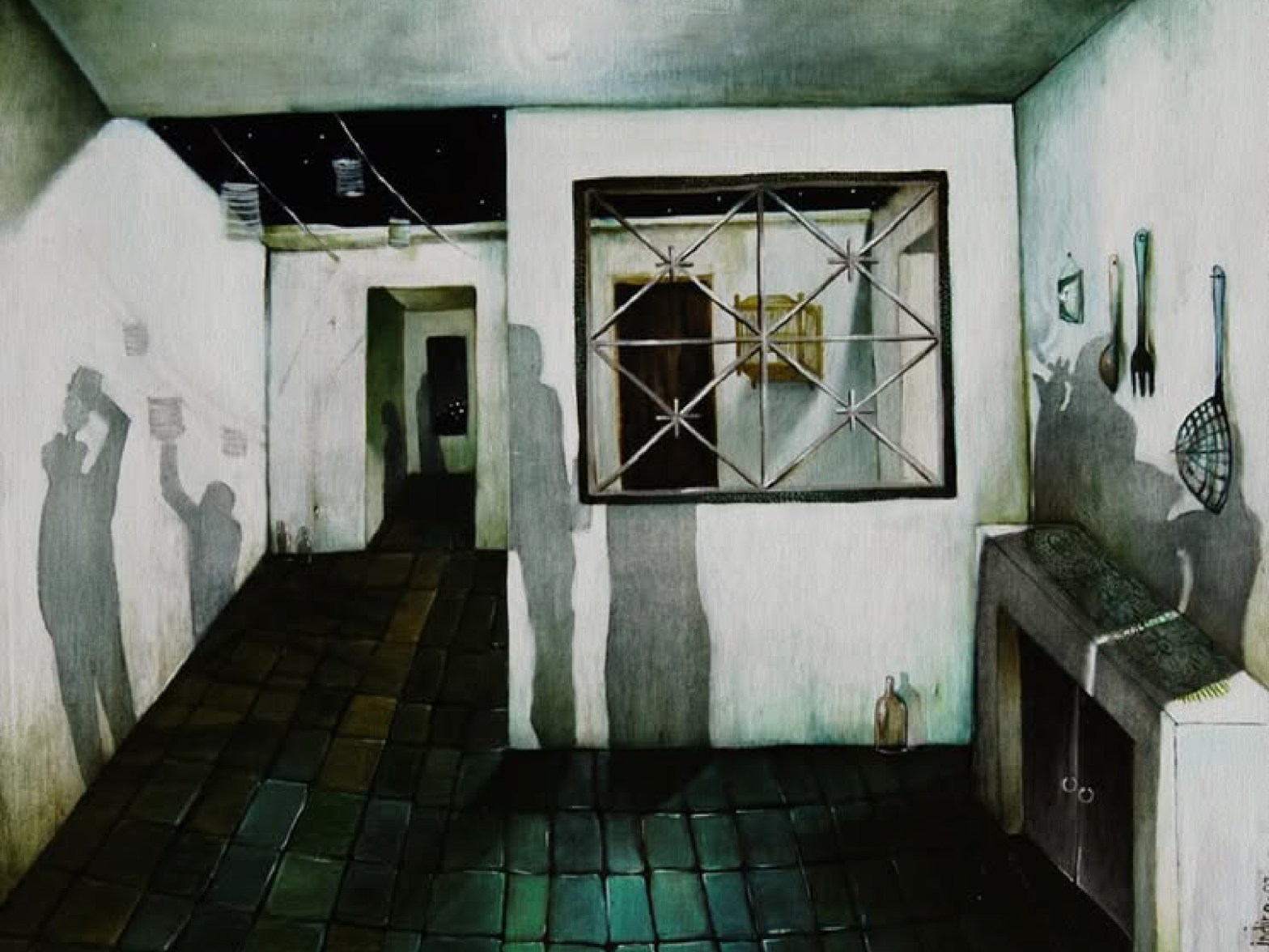 La sombra mayor suele evocarla la pintora a manera de un estado subyacente, Indira Castellón remite a la noche que nos habita, a la casa en medio de la cual lo cotidiano luego será transformado en un recuerdo, es así que; después de las celebraciones el vacío de las cosas a la deriva reflejan nuestra alma pasajera, esa misma que divaga en la mente de otros que también irán borrándose. La artista coloca al centro una ventana, detrás de la estructura asoma una jaula en desuso desde el patio libera metafóricamente los fantasmas de lo que ha dejado de ser.