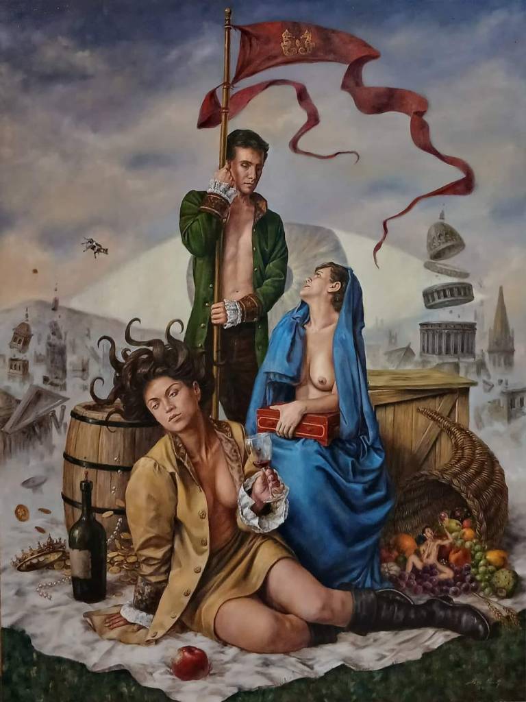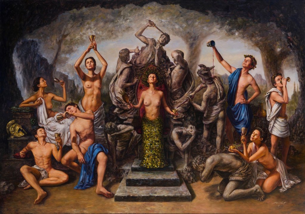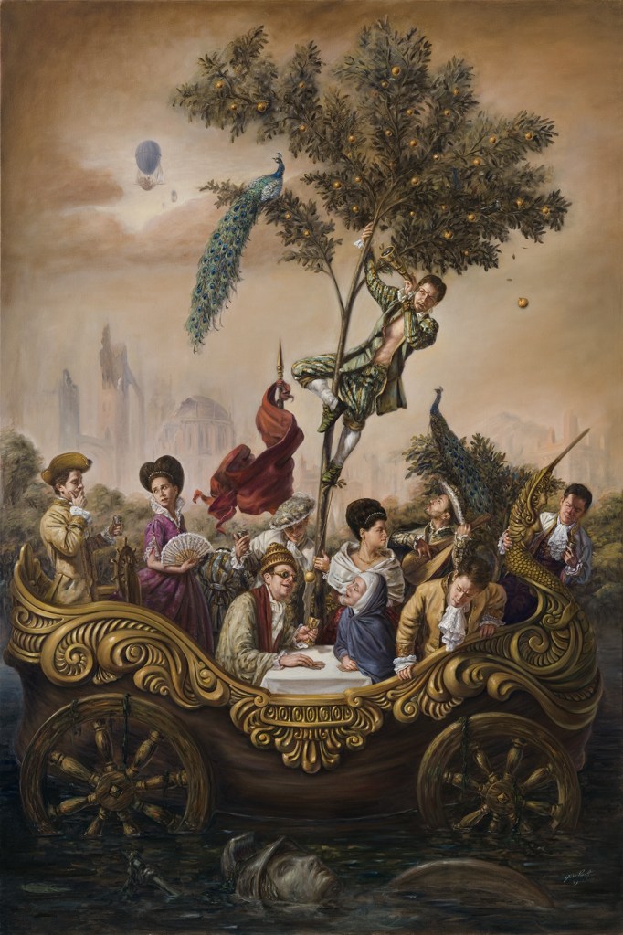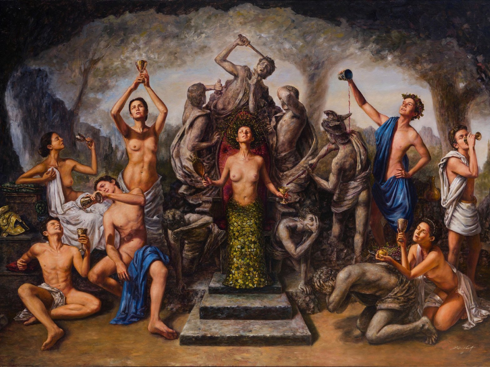 Los bebedores de las bacanales no son muy distintos de las siguientes etapas de la cultura latina, el gótico o el renacimiento, este bucle registrado por José Parra busca el localizar resonancias internas del discurso, la sangre y el vino son siempre sagrados, la manera en que aterrizan resulta de la historia personal, de los estragos inherentes a la estructura sensorial de un rito de paso. La nave de la locura que durante una época fue la solución para enviar a los locos a un sitio al que realmente pertenecían, retomada por el autor tiene los matices que el Bosco propuso al respecto si los dementes verdaderos no eran los que quedaban en la tierra de partida. José Parra propone una locura necesaria y cíclica, la cual sin embargo sucede a pesar de no elegir el momento, la modernidad por citar un anclaje al concluir la industrialización acelerada añoro el retorno a la naturaleza. El pintor la muestra como una salida a destiempo, Parra hace que el pesimismo ceda a la certidumbre de estelas de destrucción no recuperables, las grietas son permanentes, nos separa nuestra incapacidad de reconocernos en una especie ya desadaptada frente a la tierra. José Parra alejado de la moraleja menciona con irónica actitud delante de acontecimientos irremediables, es casi seguro que toda catástrofe suceda incluso mientras estamos celebrando.