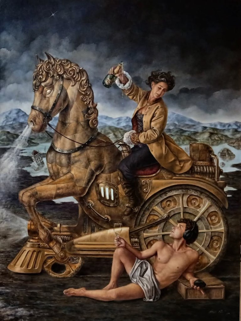 La miel de la vanidad deambula en las escenas que José Parra contextualiza en un ámbito de la memoria bastante amplio, si bien la impronta de la subcultura del Steampunk matiza ciertos hallazgos, la inquietud de fondo concuerda con el aire virreinal, en que lo contemporáneo existe a modo de una extensión intermitente. La elegancia al igual que la idea de lo moderno surgen por medio de una aspiración sustitutiva, lo nuevo persiste en lo momentáneo a espera de la sorpresa de la siguiente etapa, el lujo atesorado en dichos términos deriva en un espejismo tendiente a sucumbir al abandono. José Parra ilustra un entorno de renuncias a objetos, edificaciones, seguramente hábitos para que bajo un encantamiento que surge de la inventiva de los celebrantes el renacer sea la bandera que los individuos eleven, los triunfos ociosos o que conciernen a la consciencia de quien los ejecuta.