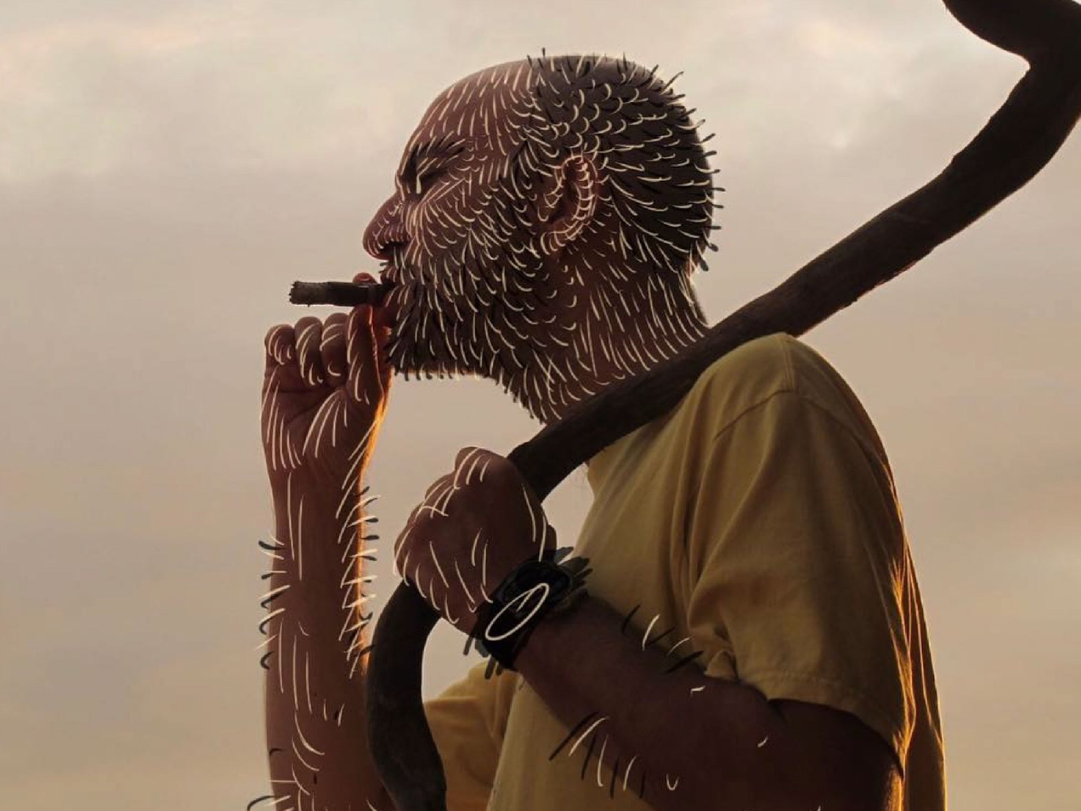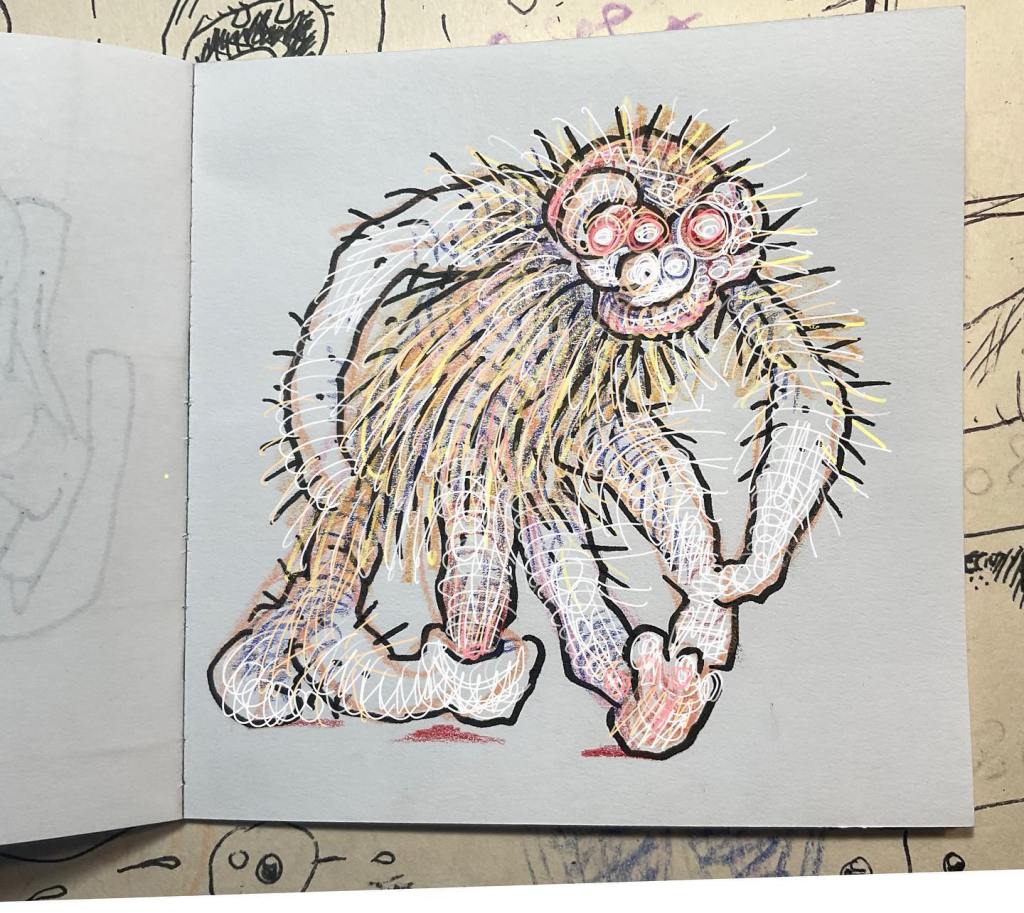Los grumos desprendidos encarnan en moscas, la imaginería de JIS no depende tanto de metáforas, sino de juegos combinatorios. Los seres informes, aplastados en semejanza con los hongos, las formas de vida por encima de lo unicelular. La anatomía del MONO inscribe una síntesis de aquello que expresa, el MONO es un portador de mensajes, a ese ente el artista José Ignacio Solórzano lo distorsiona para obtener rangos irracionales, si bien JIS aun dibuja cartones, no ilustra una inercia de pensamiento, le sustrae la piedra de la locura y adorna los ojos saltones de MONOS conscientes del vació universal, la nada blanquecina de hojas por ser ensuciadas. Las moscas frescas, recién dibujadas aglomeran trazos peludos, es un estilo de vellosidades de insectos que JIS ha trasladado a el esgrafiado de fotografías retocadas, la sombra de púas repartidas sobre el exoesqueleto son complemento del molusco, de lo que es blando y suave por dentro, la cascara de las realidades adulteradas ofrece cosechas de espejismos polivalentes.